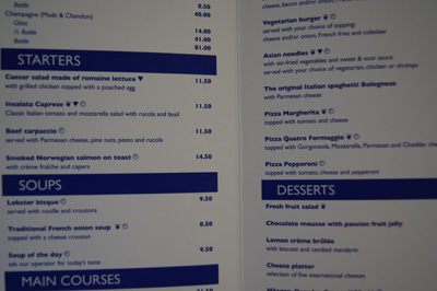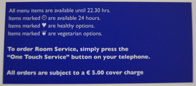 - Vše je dostupné do 22,30. Označené položky jsou dostupné 24 hodin, jsou zdravé nebo vegetariánské. Pokud si chcete objednat room service, zmáčkněte na telefonu “one touch service” (více ve spodní části článku). K objednávce si přičtěte 5 EUR za odnos na pokoj.