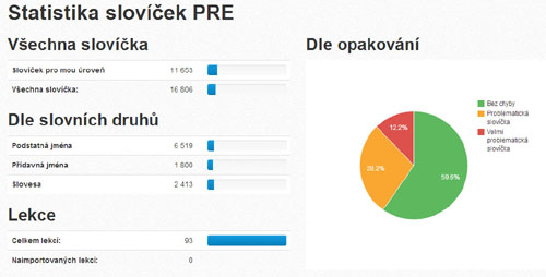 V nových statistikách zjistíte, kolik slovíček z celkového počtu v databázi již umíte (pro danou úroveň), kolik slovíček již umíte, kolik jich je mezi problematickými slovy apod.