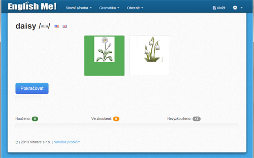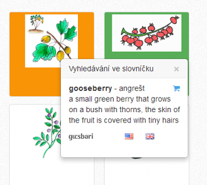 - Vhodný je i pro učení se nových slov, i když se bude z počátku jednat spíše o označování metodou pokus-omyl. Ale i tím se slova brzy naučíte. Pokud je slovo pro Vás nové, můžete si po nesprávné odpovědi prohlédnout slovíčka, která se pod obrázky skrývají a dokonce si je uložit do košíku apod. Stačí na obrázek kliknout a objeví se Vám známé slovníkové okénko.