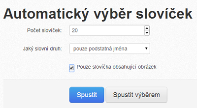 Můžete si také nechat okruh sestavit náhodně. V záložce ‘Slovní zásoba’ na horní liště zvolíte “automatický výběr”. Nyní si nastavíte, že chcete např. 20 podstatných jmen, které mají obrázek a cvičení spustíte pomocí tlačítka “Spustit výběrem”: