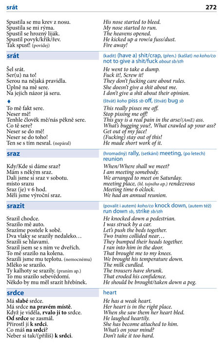 Na výše uvedené ukázce vidíte, že autoři nezapomněli ani na důležité poznámky o tom, zda se jedná o slang, vulgární spojení, britskou či americkou angličtinu apod. Ano, v mluvníku jsou obsaženy i vulgarismy, které pochopitelně k mluvené angličtině patří také.