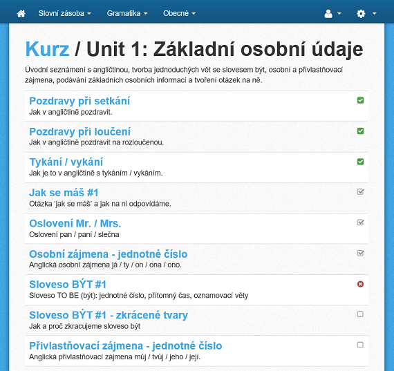 K prostudovaným lekcím je možné se kdykoliv vracet. V přehledu lekcí uvidíte, které lekce již máte přečtené a které nikoliv. Po přečtení lekce si navíc můžete lekci označit zelenou ikonkou “chápu, rozumím” nebo červenou ikonkou “nerozumím” (a k takovým se případně později vrátit).