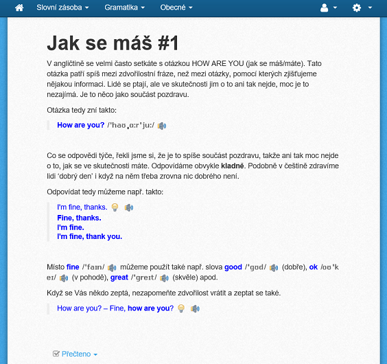 Lekce jsou krátké, stručné a lehce stravitelné. Mnohdy se vejdou na jednu stránku v prohlížeči a jsou ideální také k používání na mobilních zařízeních. Slovní zásoba a příkladové věty jsou zde doplněny nahrávkou výslovnosti rodilých mluvčích. Látku probíranou v dané lekci si lze často ihned procvičit či otestovat pomocí různorodých interaktivních cvičení. Na konci každého unitu je opakovací lekce, kde si ověříte, zda jste všechno prezentované učivo úspěšně zvládli.
