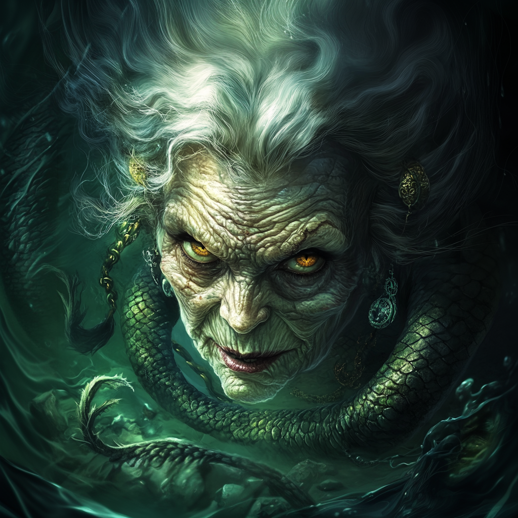 - Mořská čarodějnice se zlověstně usmála, když připravovala lektvar pro malou mořskou vílu.