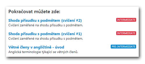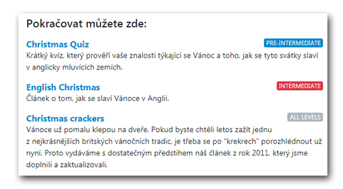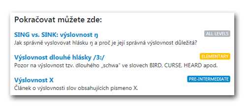Najdete je pod nadpisem ‘Pokračovat můžete zde’. Každý doporučený článek je označen úrovní, pro kterou je určen, a obsahuje i popisek.
