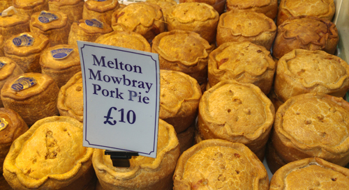 Slané koláče v těstové krustě se dají pořídit jako polotovar v supermarketech nebo na farmářských trzích. Stačí je pak ohřát v troubě (a přidat kaši s omáčkou). Zde je fotografie z nejstarší londýnské tržnice Borough Market.