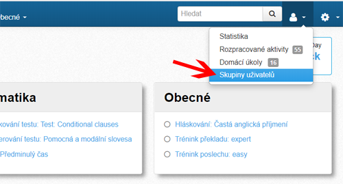 Do uživatelských skupin se dostanete pomocí menu vpravo nahoře (ikonka panáčka) a položky ‘skupiny uživatelů’.
