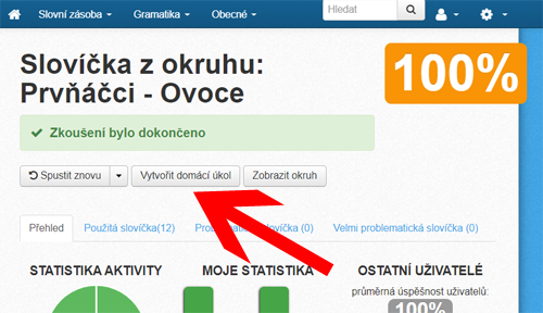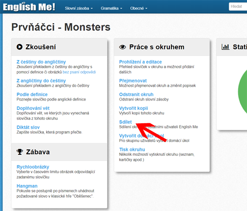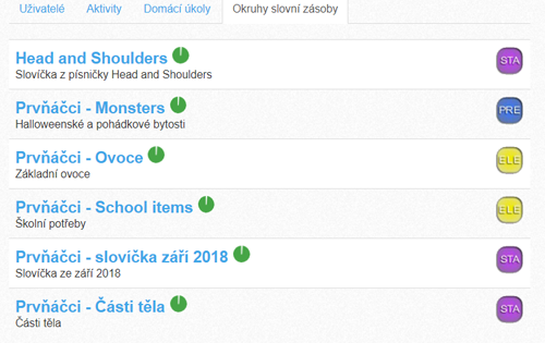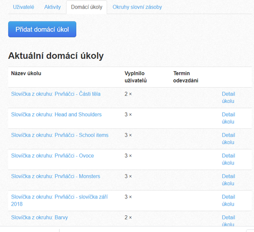 Okruhy slovní zásoby, které žákům sami vytvoříte nebo které vyberete již z připravených okruhů, nemusíte žákům zadávat jako úkol. Můžete je s nimi pouze sdílet. Oni tyto okruhy sami naleznou v přehledu sdílených okruhů v detailu své skupiny. Zde je výhodou, že se každý může slovíčka učit ne zadaným způsobem, ale jak on sám potřebuje (pomocí překladu, diktátu, výběrem z obrázků apod.) Tyto okruhy se potom ale nepočítají mezi úkoly a učitel nemá přesný přehled, kdo již úkol vypracoval a kdo nikoliv.