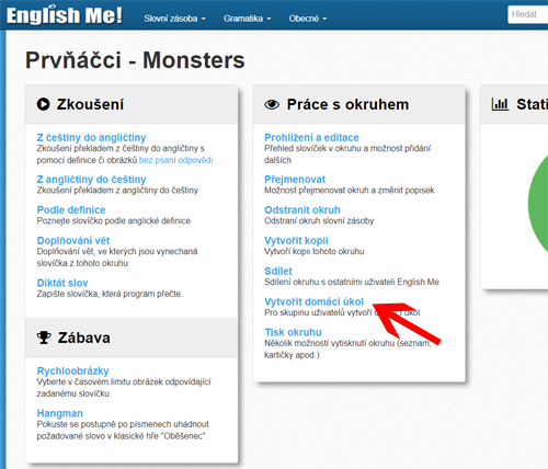 Pokud chcete žákům zadat jako domácí úkol okruh slovní zásoby, je jednodušší úkol vytvořit přímo z detailu okruhu slovní zásoby. Otevřte si stránku s přehledem okruhů slovní zásoby, najděte si ten, který chcete zadat jako domácí úkol, a klikněte na něj. Otevře se vám detail okruhu. Zde vyberte z nabídky Práce s okruhem položku ‘Vytvořit domácí úkol’.