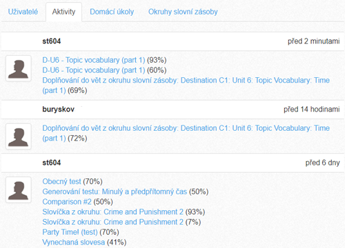 Na tomto výpisu najdete všechny aktivity členů dané skupiny včetně výsledků v procentech. Opět si lze na každou položku kliknout a podívat se, jak to uživateli šlo, v čem měl chyby apod.