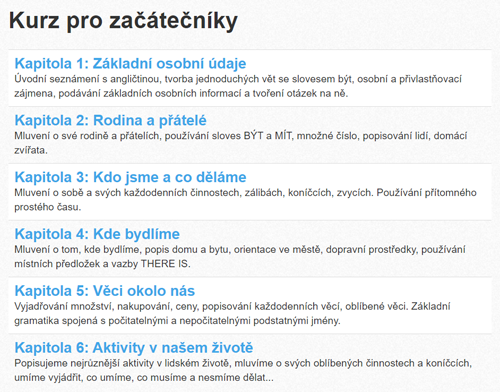Právě pracujeme na 7. kapitole, která by celý kurz měla uzavřít. Po jejím absolvování by už student neměl mát problém pracovat se studijními materiály, učebnicemi, knihami apod. na úrovni Elementary – A1.