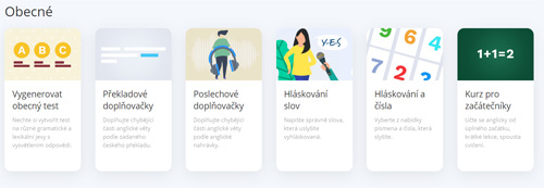 Poslední část sekce samostudium jsme nazvali obecné. Kromě možnosti vygenerovat si obecný test na slovní zásobu a gramatiku zde najdete i další druhy cvičení.