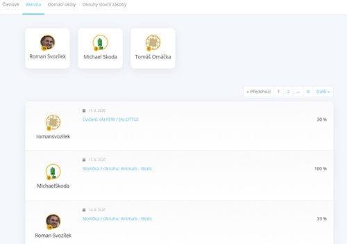 Po vytvoření skupiny uživatelů a rozeslání pozvánek můžete spravovat skupinu (či třídu) pohodlně vždy v sekci skupiny. Zde v záložce aktivita uvidíte (pokud jste administrátor) seznam všech aktivit, které členové skupiny v aplikaci udělali, včetně výsledků: