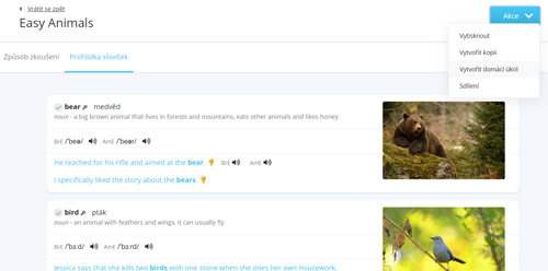 Zde jsme se například rozhodli zadat jako domácí úkol okruh slovní zásoby Easy animals.