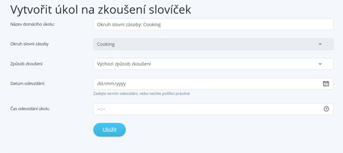 Tip: Pokud jste učitel nebo rodič a máte seznam slovíček v učebnici studenta k jednotlivým lekcím, můžete mu vytvořit vlastní okruhy slovní zásoby a on si pak tato slovíčka může procvičovat. Vy pak uvidíte (jako administrátor) výsledek, kde si můžete filtrovat i problematická slovíčka. Student si ovšem může vybrat, jakým způsobem si slovíčka bude procvičovat (jestli překladem z češtiny do angličtiny nebo naopak, nebo za použití zábavnějších forem jako jsou bleskové obrázky nebo hra Nevybouchni). Pokud si chcete sami zvolit, jakým způsobem si bude slovíčka procvičovat, zadáte mu danou aktivitu jako domácí úkol.