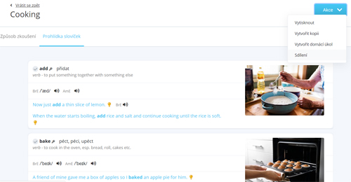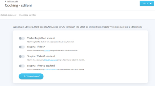 U každého okruhu slovní zásoby je vpravo nahoře možnost “akce”, kde vyberete sdílení a zvolíte, které skupině nebo skupinám daný okruh doporučíte.