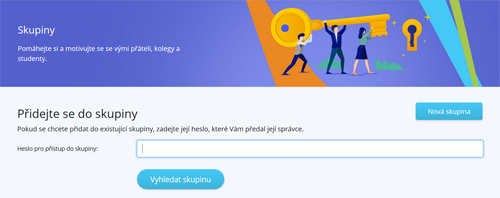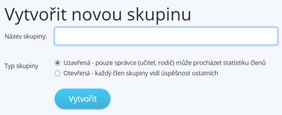 Tato část je určena hlavně pro učitele, případně rodiče studentů. Zde si zvolíte název skupiny a rozhodnete se pro uzavřenou nebo otevřenou skupinu. U uzavřené budete vidět statistiku jednotlivých členů pouze vy jako administrátor skupiny, u otevřené skupiny uvidí členové své statistiky vzájemně. Obě možnosti mají své výhody i nevýhody – výběr je na vás.
