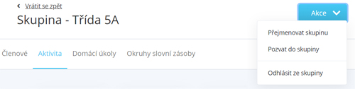 Máte tedy založenou skupinu, ve které jste pouze vy. V první záložce pak uvidíte přidané členy skupiny, dále pak jejich aktivitu v aplikaci, databázi domácích úkolů a okruhy slovní zásoby. Důležitý prvek je ikona akce, kde máte několik možností.