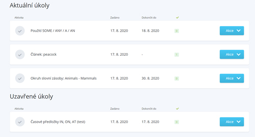 Pokud jste sám učitel, najdete zde seznam všech úkolů, které jste zadali. V naší aplikaci totiž i učitelé mají možnost si udělat zadanou aktivitu.