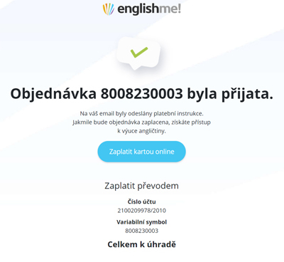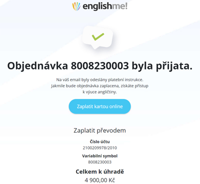 Vyplníte fakturační údaje, kde je důležitou součástí název školy (firmy) a vaše IČO, a po vytvoření objednávky ji máte možnost zaplatit platební kartou nebo převodem.