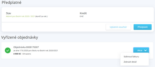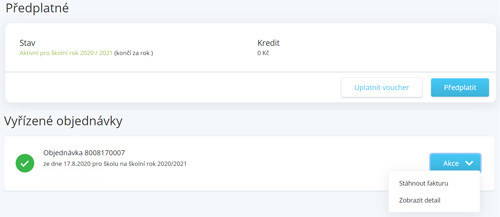 V menu vpravo nahoře zvolíte “předplatné” a zobrazí se vám stav a seznam objednávek, kde kliknete na “akce” a “zobrazit detail”:
