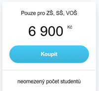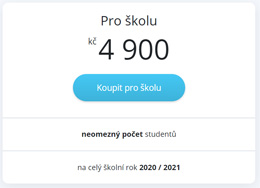 Jako naprostou novinku nyní nabízíme jednotné předplatné pro celou školu. Za zvýhodněnou cenu 6 900 Kč na jeden školní rok (od 1. září do 31. srpna) může naši aplikaci používat neomezený počet studentů a učitelů v jedné škole. Nabídka je určena pouze pro základní, střední a vyšší odborné školy.