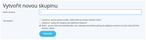 Pozn.: Zde vytváříte vždy skupiny studentů, kteří budou mít neomezený přístup do aplikace po celý školní rok. Zvolením jiné možnosti budou mít členové skupiny aktivní jen to předplatné, které si sami uhradili. Pokud jste si vytvořili skupiny ještě před zakoupením školní licence, je třeba založit skupiny znovu, aby pozvaní žáci získali bezplatný vstup do aplikace pod školní licencí.