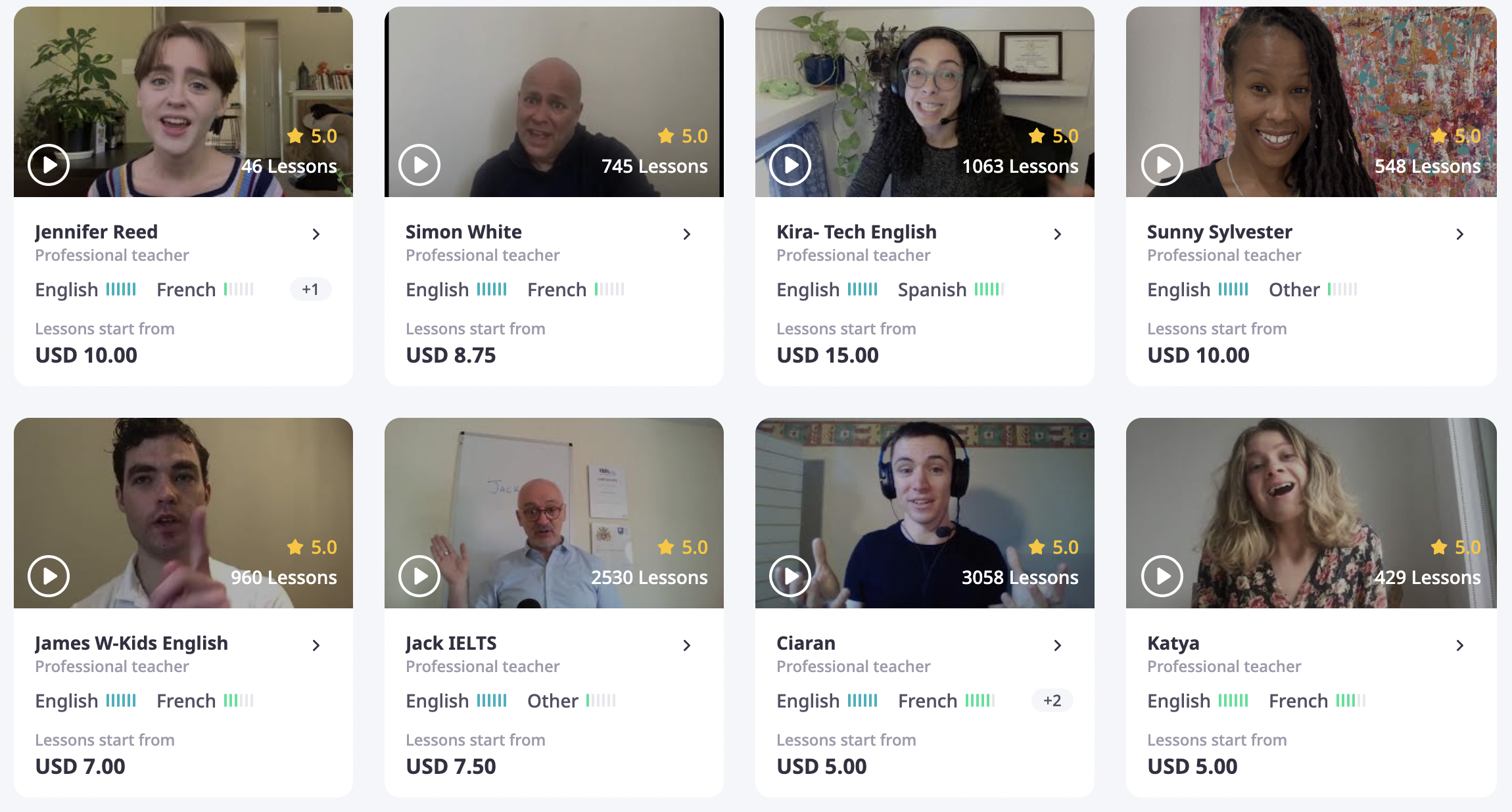 Potom už stačí projít si nabízené učitele, zhlédnout jejich videa a podívat se na jejich hodnocení (uživatelé dávají hvězdičky i píší komentáře). Pokud narazíte na někoho, koho byste si chtěli vyzkoušet, můžete si objednat jejich hodinu.
