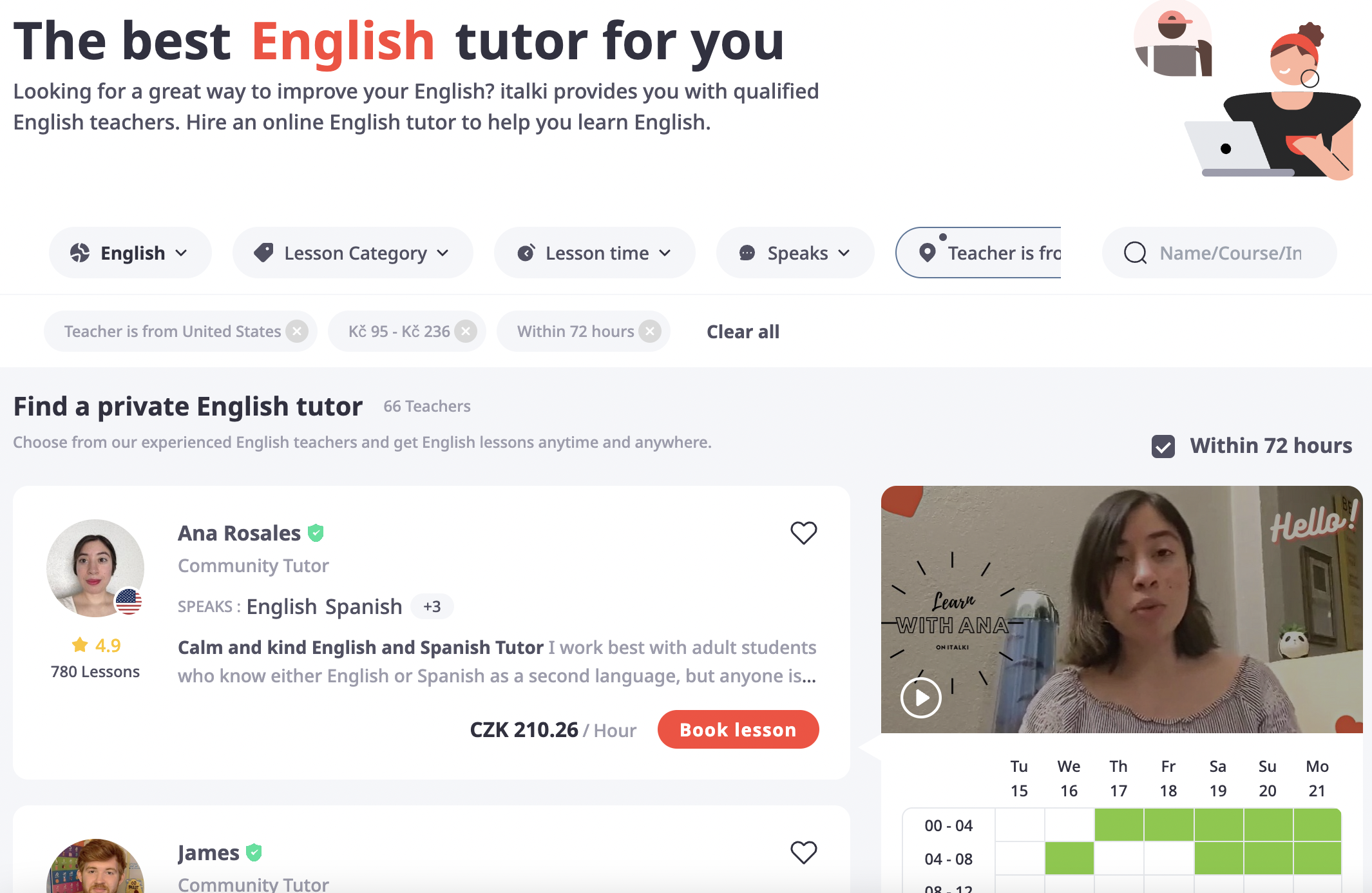 Italki je služba, která studentům cizích jazyků (samozřejmě včetně angličtiny) zprostředkovává online učitele. Po registraci (která je zdarma) začnete tím, že si vyberete jazyk, který se učíte. Potom se vám již otevře nabídka učitelů. Vybírat můžete ze stovek (či tisíců) různých učitelů! A co víc, hodiny jsou cenově velmi dostupné. Hodinu konverzace s rodilým mluvčím pořídíte už za cenu 150–250 Kč!
