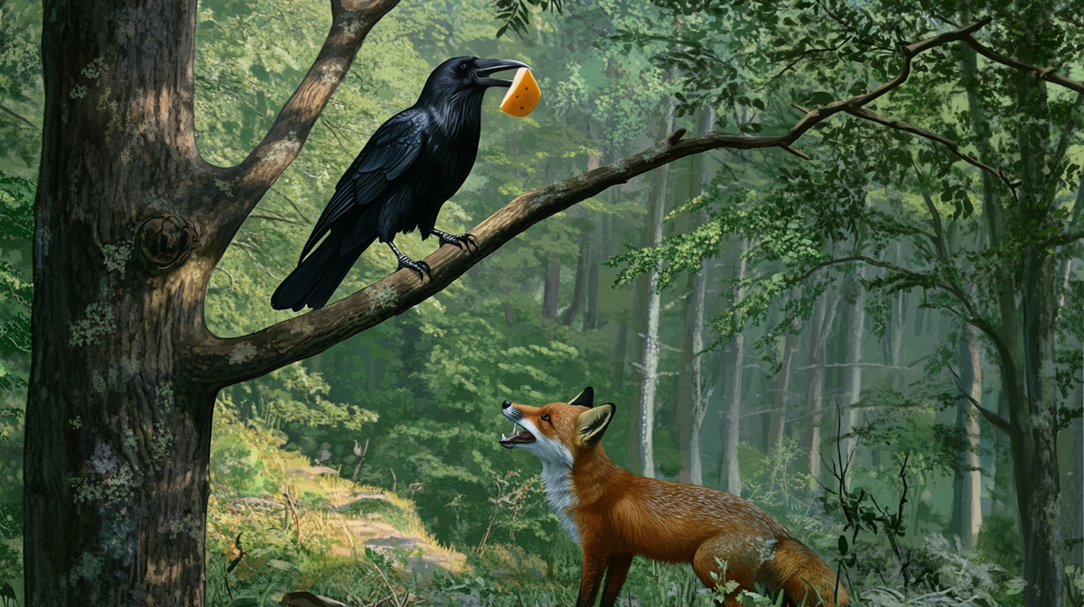 “Oh, beautiful Crow,” said the Fox, “your feathers are so shiny! I have never seen a bird as lovely as you. Your voice must be as sweet as your beauty. Will you sing for me?”