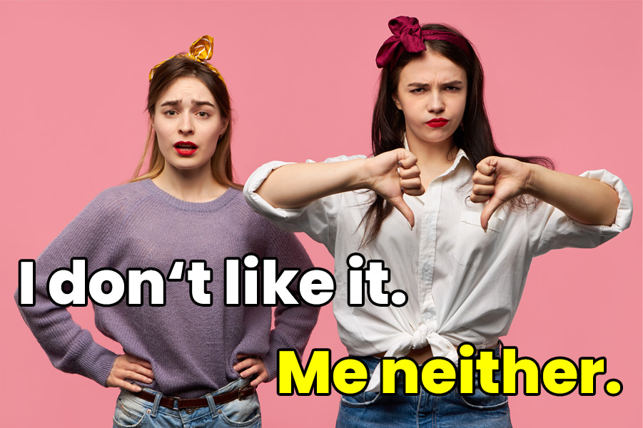 Neformální krátké přitakání bude obsahovat záporné příslovce neither/'naɪðə/ (opět existují dvě možné výslovnosti, s dvojhláskou /aɪ/ hlavně v britské angličtině a s dlouhou souhláskou /i:/ často v americké). Celé přitakání je potom: Me neither.