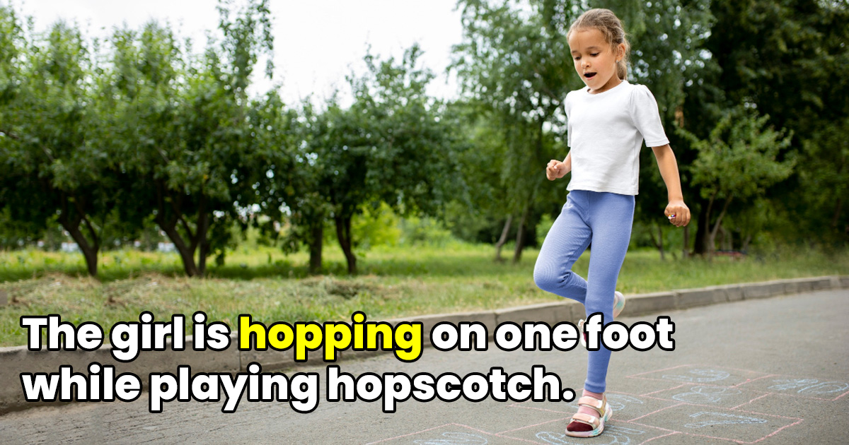 Sloveso hop/'hɒp/ pak překládáme jako poskakovat. Nejčastěji jde o krátké, rychlé skoky na jedné noze.