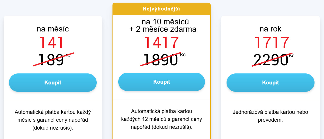 Nejoblíbenější je naše měsíční opakované předplatné, které běžně stojí 189 Kč. Když použijete slevový kód, budete měsíčně platit jen 141 Kč a tato cena vám již zůstane napořád (dokud předplatné sami nezrušíte). Toto předplatné lze pořídit pouze při placení kartou.