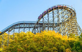a very exciting ride at an amusement park that takes people in small cars travelling on narrow tracks up and down, into sharp bends, steep drops etc.