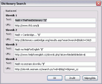 Oproti DT je to sice méně pohodlné, ale výhoda zase je, že si můžete přidat slovníky, jaké chcete. Stačí, když dáte hledat nějaké slovo v tom slovníku, který chcete využívat, zkopírujete potom jeho adresu, v nastavení rozšíření to vložíte do kolonky URL a slovíčko, které jste hledali, a je v té adrese nahradíte znakem dolaru ($). V té adrese bývá většinou i nějaký balast, ale pokud vám to funguje, tak to nechte jak to je. Jako text doplňte třeba "Najít $ na jmeno-slovniku". Viz obrázek.