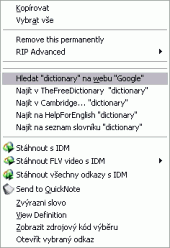 Dalším parádním rozšířením je rozšíření Dictionary Search, které vám zase při označení slovíčka kdekoliv na webu přidá do menu odkaz na vyhledání toho slovíčka ve slovníku. Tentokrát se ale neotevře vyskakovací okno, ale nový panel.