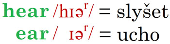 Občas sloveso hear chybně vyslovují i pokročilejší studenti, což už je na pováženou. Inu, co se člověk špatně naučí v základech, dlouho se toho později zbavuje. Také si všimněte podobnosti slovíček ‘slyšet’ a ‘ucho’, která ve správné výslovnosti může pomoci: