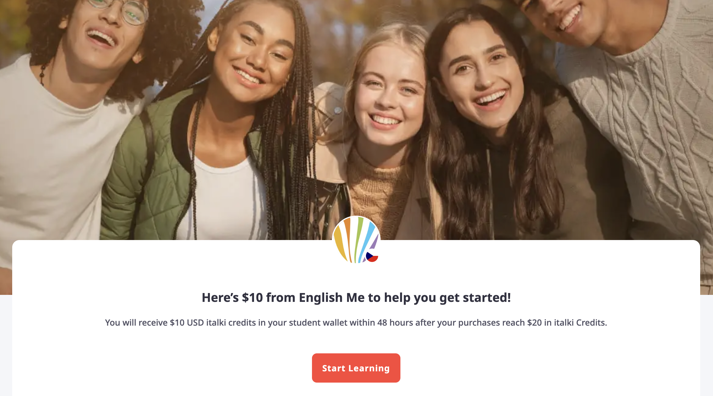 Zaregistrujte se do Italki tím, že kliknete na následující odkaz, absolvujte několik konverzačních (či jiných) hodin v celkové hodnotě 20 dolarů (cca 500 Kč) a získejte bonusový kredit 10 dolarů!
