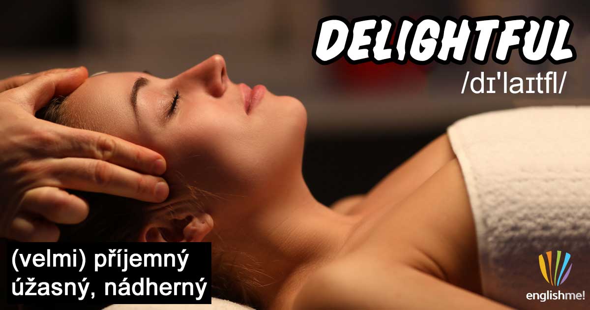 Přídavné jméno delightful/dɪ'laɪtfl/ můžeme přeložit jako příjemný, úžasný, nádherný, rozkošný. Přízvuk je až na druhé slabice a pozor také na koncové /fl/. Popisuje cokoli, co člověku přináší potěšení či příjemný požitek, včetně chuťových, sluchových, čichových a dalších vjemů.