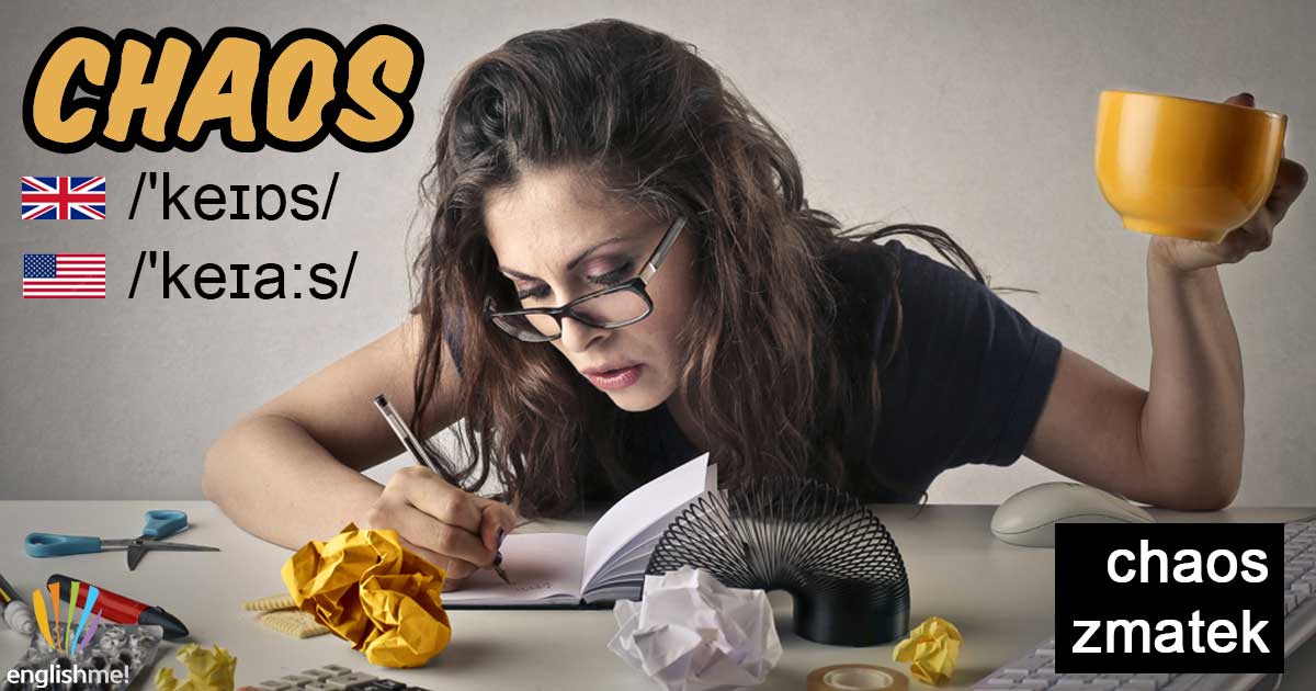 Podstatné jméno chaos/‘keɪɒs/ znamená v angličtině i češtině to samé, tedy chaos, zmatek. V angličtině stojí za povšimnutí určitě výslovnost. Na začátku je 'k’ (hlásku ‘ch’ angličtina ani nemá, více v článku Písmeno CH v angličtině) a následuje dvojhláska /eɪ/ a za ní samohláska /ɒ/, případně /ɑ:/.