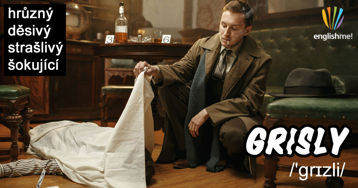 Přídavné jméno grisly/'grɪzli/ znamená hrůzný, děsivý, strašlivý, šokující a používá se ve spojení se smrtí, násilím apod. Podobný význam má např. gruesome/'gru:səm/.