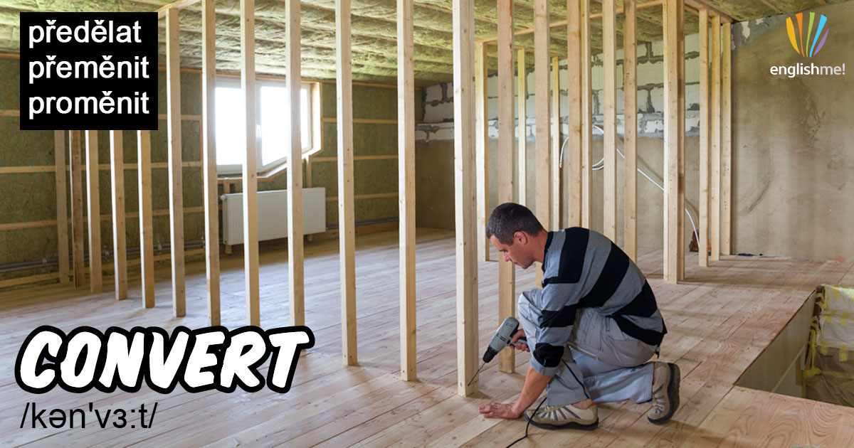 Sloveso convert/kən'vɜ:t/ můžeme přeložit jako předělat, přeměnit, proměnit, převést apod. Používá se v tom smyslu, že se z jedné věci udělá něco jiného. Ve výslovnosti pozor na přízvuk na druhé slabice. Všimněte si zde také předložky into.