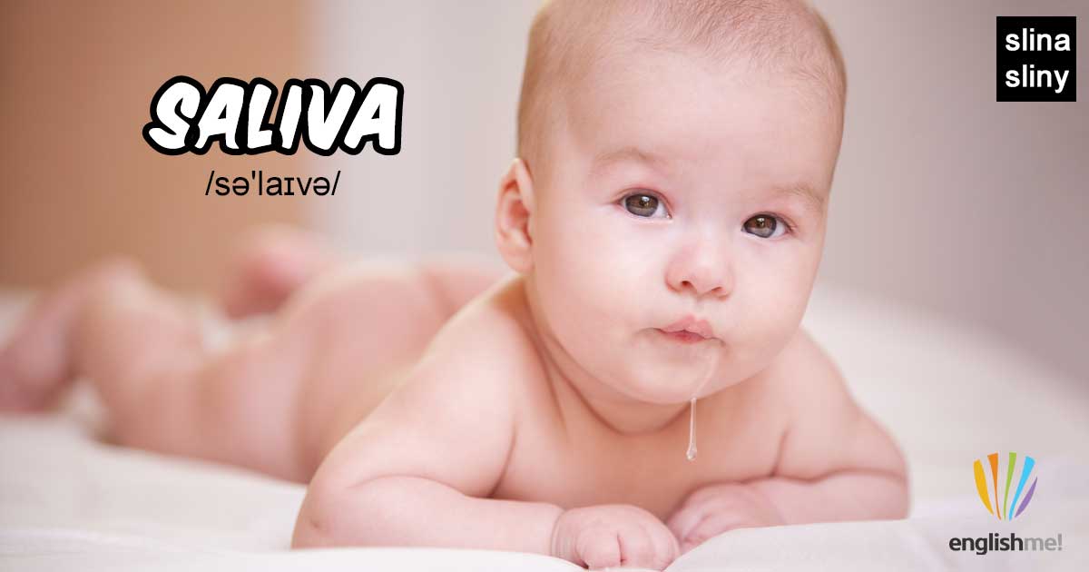 Nepočitatelné podstatné jméno saliva/sə'laɪvə/ znamená slina, sliny. Pozor na výslovnost (přízvuk na druhé slabice a uprostřed je /aɪ/).