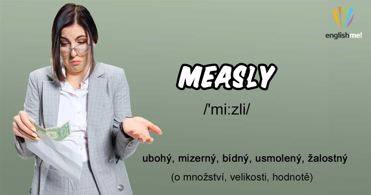 Hovorové přídavné jméno measly/'mi:zli/ má význam ubohý, mizerný, bídný, usmolený, žalostný, pokud se bavíme o množství, velikosti či hodnotě.
