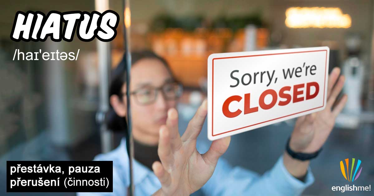 Podstatné jméno hiatus/haɪ'eɪtəs/ lze přeložit jako pauza, přestávka či pozastavení, přerušení nějaké činnosti. Pozornost tu věnujte určitě i výslovnosti.