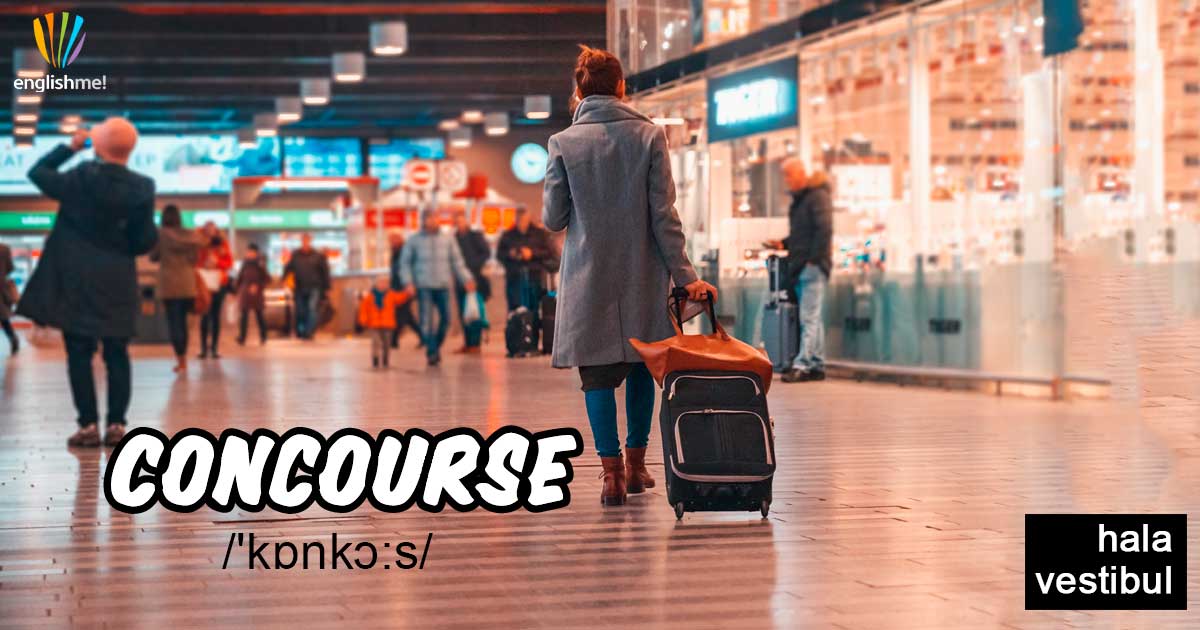 Podstatné jméno concourse/'kɒnkɔ:s/ označuje nějakou velkou halu či vestibul, např. na nádraží, ve stanici metra, na letišti apod., obzvláště takovou, kde jsou různé obchody, kiosky atd.